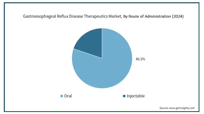投与経路に基づき、胃食道逆流症治療薬市場は経口剤と注射剤に区分されます。経口投与経路は市場の支配的なセグメントとして台頭し、2024年には売上シェアの80.2%を占め、2034年には53億米ドルに達する見込みです。