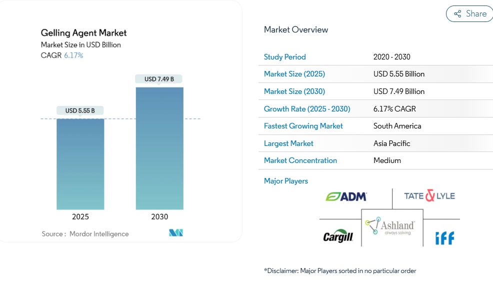 中堅企業は、組織スキャフォールドや生分解性包装など、専門的な用途に注力し、柔軟性と顧客との密接な関係を活かしています。大手企業は、原料供給の変動や天候関連の混乱に備えるため、海藻栽培事業や発酵代替技術への投資を進めています。こうした多様な事業戦略が市場競争を維持し、ゲル化剤産業における継続的なイノベーションを支えています。