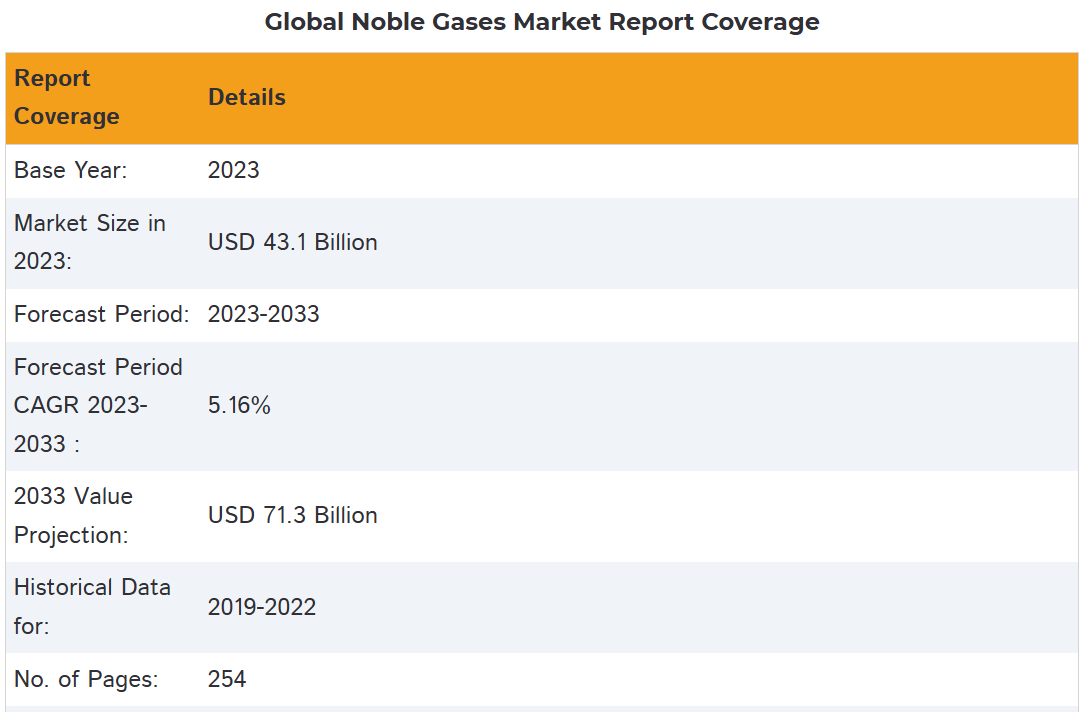 Global Noble Gases Market Size, Share, and COVID-19 Impact Analysis, By Product Type (Argon, Krypton, Helium, Neon, Xenon, Radon, Others), By Distribution (Bulk, Cylinder, Others), By End-use Industry (Electronics, Aerospace, Construction, Healthcare, Energy & Power, Others), and By Region (North America, Europe, Asia-Pacific, Latin America, Middle East, and Africa), Analysis and Forecast 2023 – 2033