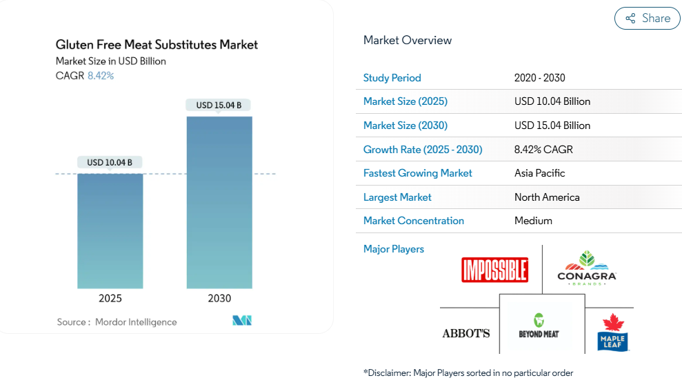 グルテンフリー肉代替品市場は中程度の分散状態にあり、上位5社であるビヨンドミート社、インポッシブルフーズ社、コナグラブランズ社、アボッツブッチャー社、メープルリーフフーズ社が収益の大部分を占めています。この支配的状況は、地域的な新規参入企業が市場での地位を確立する余地を残しています。ビヨンドミート社とインポッシブルフーズ社は、ファストフード店(QSR)への広範な展開と積極的なブランドストーリーテリングにより、市場での存在感を維持することに成功しています。しかしながら、両社の粗利益率は、製品における主要原料であるエンドウ豆タンパク質のコスト変動の影響を受けやすい状態が続いております。