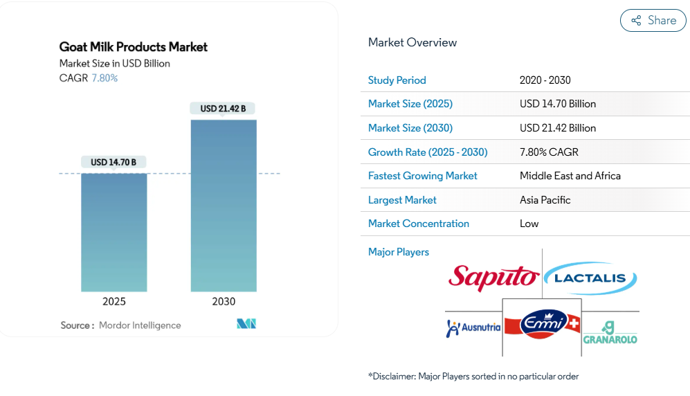 世界的に、乳糖不耐症および牛乳アレルギー症例の増加が、ヤギ乳製品市場の成長を促進しております。世界の人口の約65~68%が、何らかの形で乳糖吸収不良を経験しており[1]、アジア、アフリカ、中東諸国の多くでは70%を超える割合が報告されております。従来型の牛乳は、乳糖不耐症の方には腹部膨満感、けいれん、下痢を引き起こす可能性があり、また他の方にはアレルギー反応を引き起こす恐れがあります。その結果、多くの消費者が代替乳製品に目を向けています。ヤギ乳は、天然の乳糖含有量が低く、タンパク質の構造が異なるため、アレルギー反応のリスクが低く、好まれる代替品となっています。この変化は、健康意識の高まり、大手食品企業による乳糖フリー製品の拡充、そしてパーソナライズド栄養への世界的な転換によってさらに加速しています。その結果、特に乳糖不耐症が顕著な地域において、ヤギ乳およびその派生製品の需要が急増しており、消化しやすく栄養価の高い乳製品選択肢としてのヤギ乳の地位を確固たるものにしています。