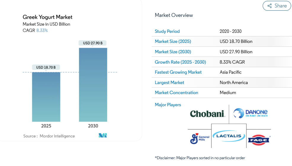ギリシャヨーグルト市場の規模は2025年に187億米ドルであり、2030年までに279億米ドルに達すると予測されています。これは予測期間を通じて年平均成長率(CAGR)8.33%に相当します。ニッチな地中海地域の定番食品から主流の機能性食品への転換は、2024年3月に米国食品医薬品局(FDA)が発表した「定期的なヨーグルト摂取が2型糖尿病リスクを低下させる」という適格健康表示に大きく起因しています。