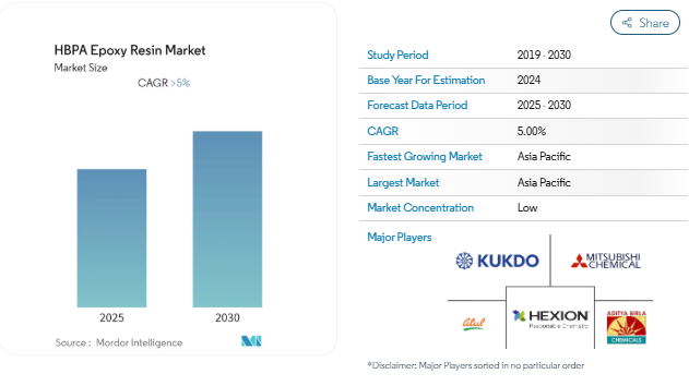 Hexion、KUKDO CHEMICAL CO., LTD.、Epoxy Division Aditya Birla Chemicals (Thailand) Limited、Atul Ltd.、三菱化学がHBPAエポキシ樹脂市場で事業を展開している主要企業です。
