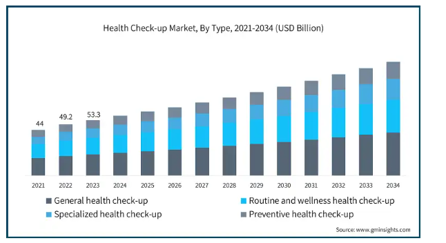 2021年の世界市場規模は440億米ドル。翌年には492億米ドルに微増し、2023年にはさらに533億米ドルに上昇しました。種類別では、一般健診、専門健診、予防健診、定期健診・ウェルネス健診に分類。一般健康診断分野は、事業成長を牽引し、年平均成長率6.5%で拡大し、2034年には413億米ドル以上に達する見込み。