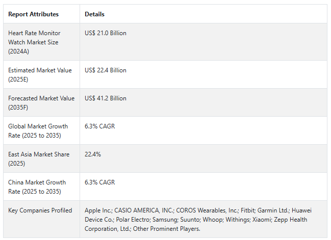 市場調査および競合情報を提供するFact.MRによると、前述の事実を背景に、心拍モニターウォッチ市場は2025年から2035年の予測期間中にCAGR 6.3%で成長すると予測されています。