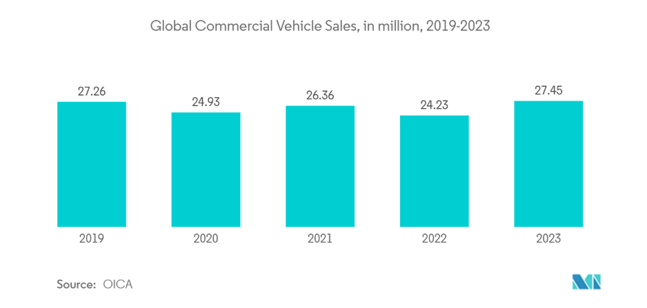 - 国際自動車工業連合会(OICA)の報告によれば、2023年の世界の商用車販売台数は27,452,301台に達し、2022年比13.3%の増加を記録しました。さらに、2023年の生産台数は約26,413,029台となっています。販売台数と生産台数の両方の増加は、市場をさらに押し上げる見込みです。