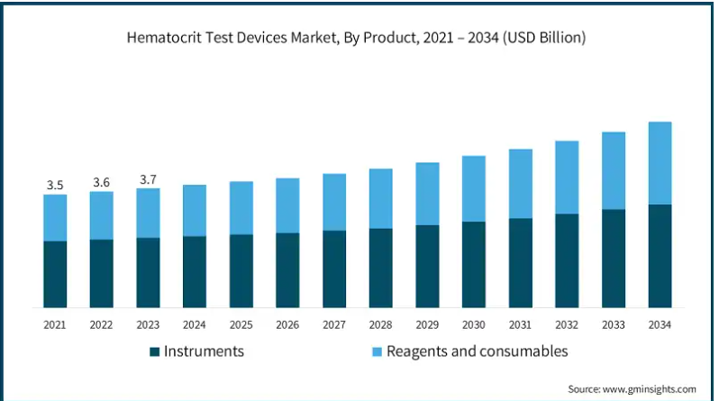 市場は製品別に機器、試薬、消耗品に分類されます。機器セグメントはさらにヘマトクリット検査アナライザーとヘマトクリット検査メーターに二分されます。2024年の売上高が最も高いのは機器分野で22億米ドル。