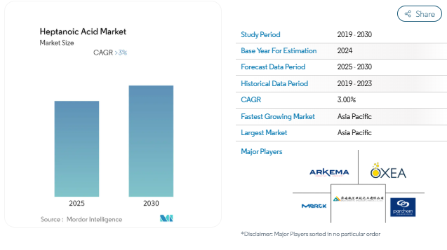 ヘプタン酸市場は予測期間中(2025-2030年)に3%を超えるCAGRを記録すると予測されています。