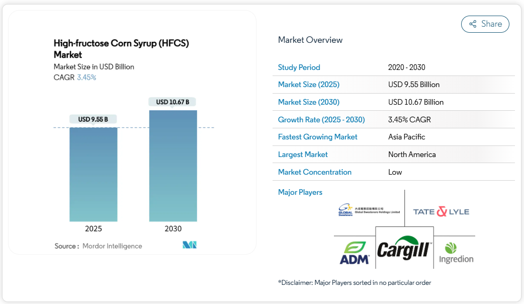 高果糖コーンシロップ市場は依然として分散状態にあり、集中度スコアは10点満点中3点となっています。これは、主要企業が生産能力の大部分を支配しているにもかかわらず、市場シェア拡大の大きな機会が存在することを示しています。カーギル、ADM、イングレディオンなどの主要企業は、それぞれ異なる戦略を展開しています。ADMはHFCS生産から持続可能な代替品へ注力を移行中である一方、イングレディオンは引き続き堅調な業績を維持しており、2024年には甘味料が純売上高の34%を占めています。