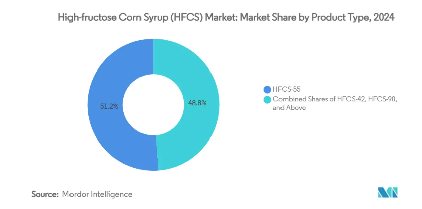 HFCS-55の液状形態は、結晶性砂糖に伴う溶解の問題を克服します。これにより飲料メーカーは、一貫した甘味プロファイルの確保、生産効率の向上、加工コストの削減、品質管理の強化が可能となります。55%のフルクトース含有量により、HFCS-55は優れた甘味と風味増強効果を発揮し、炭酸飲料やフルーツ飲料に最適な選択肢となっております。この優位性は、2024年の飲料セグメントにおける46.57%の市場シェアに反映されております。サトウキビ糖代替品に関する議論が続く中でも、コカ・コーラ社がHFCSを継続使用している事実は、大規模飲料生産における技術的優位性を示しております。HFCS-55は温度変化に対する安定性が高く、冷蔵保管や輸送の物流を簡素化します。これにより、多様な気候条件下で事業を展開する流通業者のサプライチェーンの複雑さが軽減されます。HFCS精製のための膜技術革新は、分離精度を高め不純物を低減することで製品品質を向上させ、高級飲料用途の要求を満たします。FDAがHFCSを「天然」原料として認定したことで、飲料ブランドは機能性を損なうことなくクリーンラベル戦略を採用する柔軟性を得ています。
