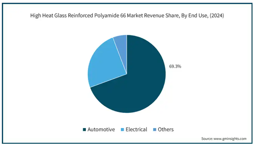 自動車分野の高熱(熱安定化)ガラス強化ポリアミド66市場は、2024年に69.3%の市場シェア、29億米ドルを占め、2025年から2034年までの年平均成長率は8.1%と予測されています。