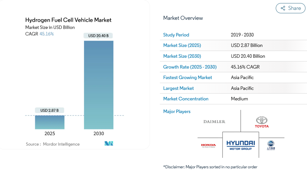 競争は中程度の集中度で推移しています。トヨタ、ヒュンダイ、ホンダは、数十年にわたるスタックの研究開発と車両統合のノウハウを活用しています。2025年に開催されたBMW-ヒュンダイ-トヨタ水素輸送フォーラムでは、大型プラットフォーム間の規格の調和が図られ、生産量が小規模な分野では協力関係にあることが明らかになりました。ダイムラーやボルボなどの欧州のトラックメーカーは、Cellcentric社のスタックを搭載し、ニコラなどの米国の新規参入企業は、トラックと燃料のセットリースモデルに注力しています。