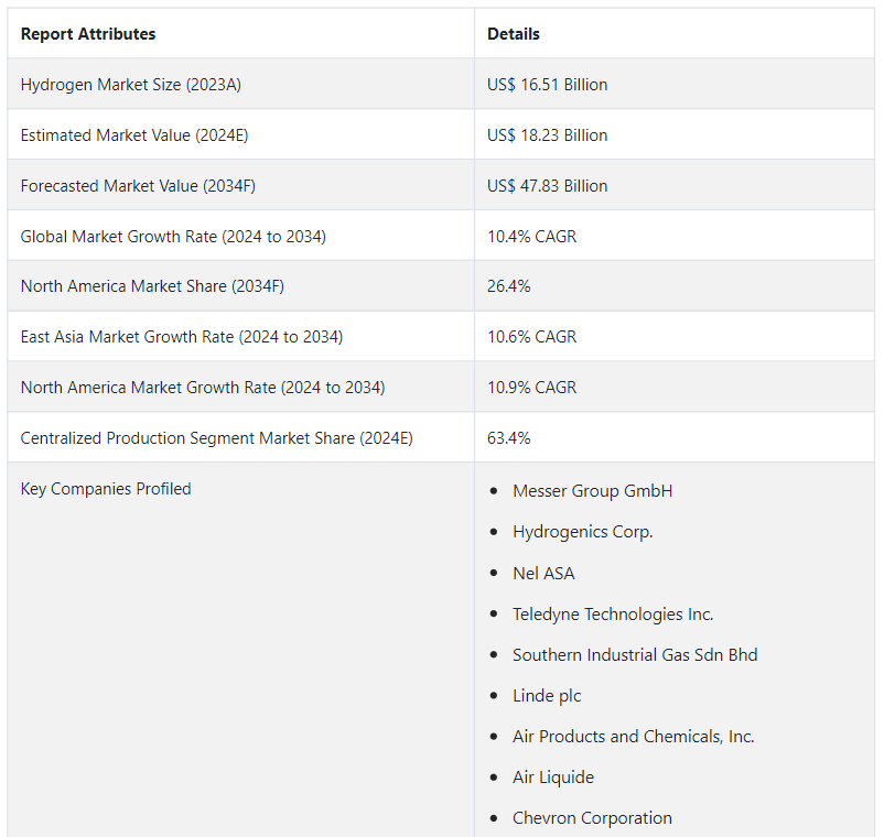 2034年末までに、水素の世界売上高は478億3,000万米ドルに達すると予測されている。