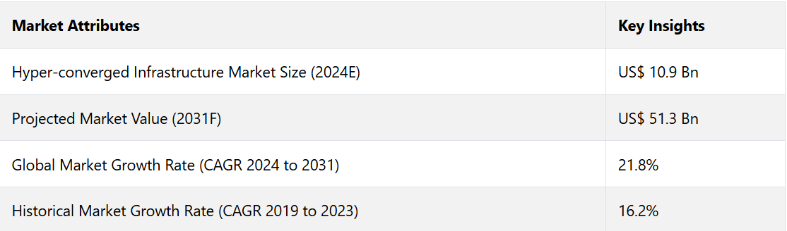 世界のハイパーコンバージドインフラ市場は、2024年までに109億米ドルに達すると予測されています。予測期間中のCAGRは21.8%と予測されており、2031年までに513億米ドルの価値に達すると予測されています。中小企業は、特にハイブリッドまたはマルチクラウド環境を低コストで管理するために、HCIソリューションを採用しています。