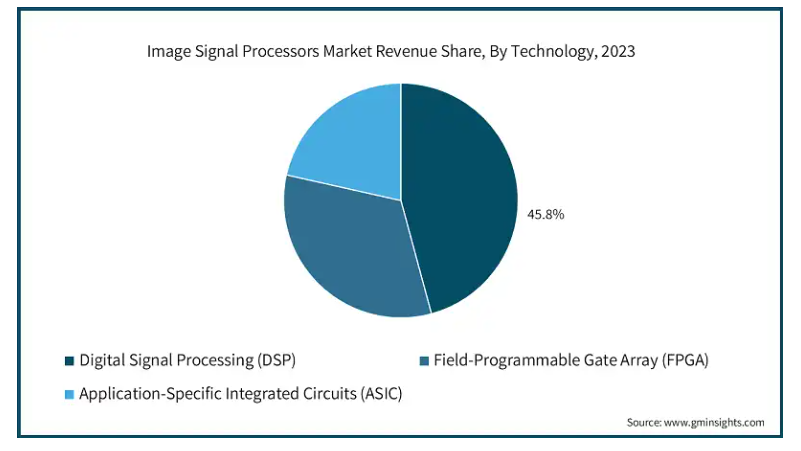 技術に基づいて、画像信号処理市場はデジタル信号処理(DSP)、フィールドプログラマブルゲートアレイ(FPGA)、およびアプリケーション特化型集積回路(ASIC)に分類されます。デジタル信号処理(DSP)セグメントは最大のセグメントであり、2024年に市場シェアの45.7%を占めると予測されています。