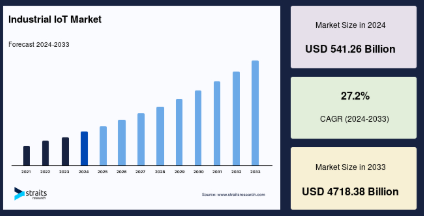 | 世界の産業用IoT市場は、2024年に5412億6000万米ドルと評価され、2025年には6884億9000万米ドル、2033年には47183億8000万米ドルに達する見込みです。この期間中の年平均成長率は27.2%と予測されています。市場の成長には、インテリジェントな自動化の進展や運用コスト削減、5Gインフラの導入拡大が寄与していますが、発展途上国ではインフラの不足が市場成長を阻害する要因となる可能性があります。2030年までに1200億台以上のIoTデバイスがオンラインになると予測されていますが、現在のインフラでは実現が難しいとされています。 産業用IoT市場の成長要因として、IoTに対する認識と採用の増加が挙げられます。ロボット工学や医療機器、ソフトウェア定義の生産プロセスなど、様々な産業でIoTソリューションが広く採用されています。また、政府の取り組みも市場の拡大を促進しており、インダストリー4.0への対応が求められています。しかし、プライバシーやサイバーセキュリティの問題が市場の成長を抑制する要因ともなっています。 技術の進歩や新製品の投入は市場に好影響を与えると予想されており、特に低価格のセンサーやプロセッサの普及がリアルタイムデータへのアクセスを可能にしています。北米が市場の主要地域であり、様々な産業分野でのIoTの導入が進んでいます。アジア太平洋地域は成長地域として注目されており、中国や日本などでの高度なファクトリーオートメーションが進行中です。 市場はセグメント別に、ソリューション、サービス、プラットフォームに分かれ、製造、農業、ヘルスケア、エネルギー、物流などのアプリケーションが存在します。特に製造業が高い市場貢献度を持ち、ロジスティクスや輸送分野でも成長が見込まれています。主要なプレーヤーには、Huawei、Cisco、General Electric、ABB、IBMなどが含まれています。 最近の動向では、シリコンラボがカスタマイズ製造サービスを開始し、ARMはIoT向けのトータルソリューションを拡大しています。Intelも新しいプロセッサを発表しました。これらの動向は産業用IoTの成長に寄与するでしょう。全体として、産業用IoT市場は今後も拡大を続けると見込まれており、各地域や産業において様々な機会が生まれることでしょう。 |