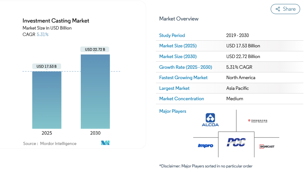 競争の激しさは中程度であり、上位5社が世界の収益のかなりのシェアを占めています。プレシジョン・キャストパーツ社が首位に立ち、カールトン・フォージ・ワークス社やチタニウム・メタルズ社などの買収により、溶融金属から完成品アセンブリまでをカバーする体制を強化しています。同社は2023年に93億米ドルの収益を報告し、エンジン納入量の増加に伴い2024年第2四半期には27.5%の収益急増を記録しました。[3] ウィンサート社はアロイ・キャスト・プロダクツ社の買収によりコバルト合金生産能力を拡大し、航空宇宙および発電用摩耗部品分野での足場を固めました。ゲオルグ・フィッシャー社は研究開発主導の差別化を重視し、軽量合金およびデジタル鋳造システムへ資金を集中させています。