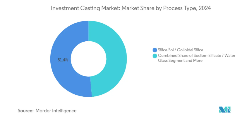 2024年、シリカゾル製シェルは投資鋳造市場収益の51.36%を占めました。これは表面粗さRa 1.6 µm未満を要求するタービンブレードや整形外科インプラントプログラムからの堅調な需要を反映しています。プリントセラミックコアとシリカゾル表面コートを組み合わせたハイブリッドシェルは、ワックス消費量の削減と焼出しサイクルの短縮により、5.35%という最速の年平均成長率(CAGR)を記録しています。ケイ酸ナトリウムプロセスは、投資鋳造市場においてコスト重視のポンプ・バルブ受注を引き続き担っていますが、買い手の仕上げ要求が高まるにつれシェアは低下傾向にあります。新興のプリント投資鋳造シェルワークフローは工具不要の生産を可能にし、パターンリードタイムを短縮するとともに、迅速なプロトタイプロット向けのオンザフライ幾何形状変更を実現します。シェル材料の研究では、より微細なアルミナ粉末とポリマーバインダーが熱膨張の不一致を低減し、亀裂による手直し率を2%未満に削減することが示されています。