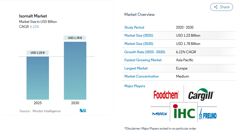 イソマルト市場は中程度の集中度を示しており、これは数十年にわたる商業運営を通じて確立された企業が大きな生産能力と規制に関する専門知識を構築してきたことを反映しています。市場リーダー企業は、原材料調達から最終製品流通までをカバーする統合サプライチェーンを活用し、新規参入者に対する参入障壁を築くと同時に、コスト最適化と品質管理を実現しています。