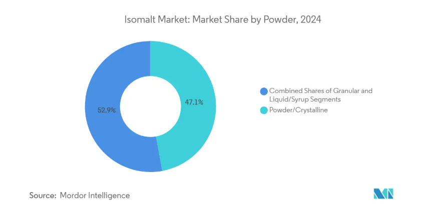 2024年現在、粉末/結晶状イソマルトは市場シェアの47.12%を占めており、優れた取り扱い性と保存安定性が評価される固形形態が、菓子製造分野で確立した地位を保っていることがわかります。液体/シロップ製剤は2030年まで年平均成長率6.80%で成長が見込まれており、これは主に自動混合システムへのシームレスな統合により、工業的食品生産における加工効率を向上させる能力によるものです。顆粒形態は中間的な位置を占め、取り扱い利便性と効果的な溶解特性のバランスを提供します。