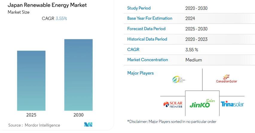 日本再生可能エネルギー市場は、予測期間(2025年~2030年)に3.55%のCAGRを記録すると予測されています