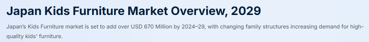 Bonafide Research社の調査レポート「日本の子供用家具市場の展望、2029年」によると、日本の子供用家具市場は2024年から29年までに6億7000万米ドル以上になると予測されています。主要な推進要因の1つは、核家族数の増加と世帯サイズの縮小によって特徴付けられる家族構造の変化です。この傾向により、親は子供部屋により多くの投資を行うようになり、個人の個性を反映し、創造性を育む専用スペースを作るようになりました。また、日本政府による子育て支援策(家庭への経済的優遇措置など)も、子ども用品への支出を増やす一因となっています。日本の文化では教育が重視されているため、機能的な家具への需要が高まっています。この傾向には、勉強中の正しい姿勢と快適さを促進するために、人間工学に基づいた机や椅子を備えた学習スペースへの投資も含まれます。持続可能性も消費者の意思決定において重要な要素であり、多くの親が無害で環境に優しい素材を使った家具を積極的に求めています。地元のメーカーは、再生可能な資源の使用や厳しい安全基準を満たす製品の確保など、持続可能な慣行を生産工程に取り入れることで、この需要に応えています。ソーシャルメディアや育児ブログの影響も、消費者の嗜好を形成しています。このようにデジタルでのプレゼンスが高まるにつれ、ブランドは消費者とつながりやすくなり、自社の製品を効果的にアピールしやすくなっています。
