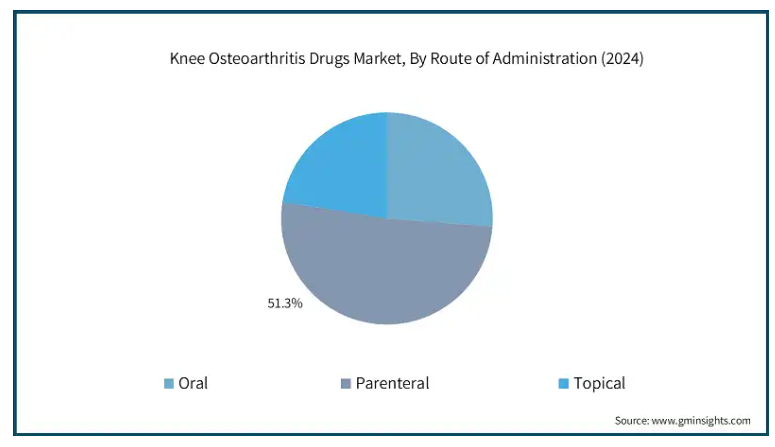 変形性膝関節症治療薬の世界市場は、投与経路に基づき、経口剤、非経口剤、局所剤に分類されます。2024年の市場シェアは、非経口剤が51.3%で最多。