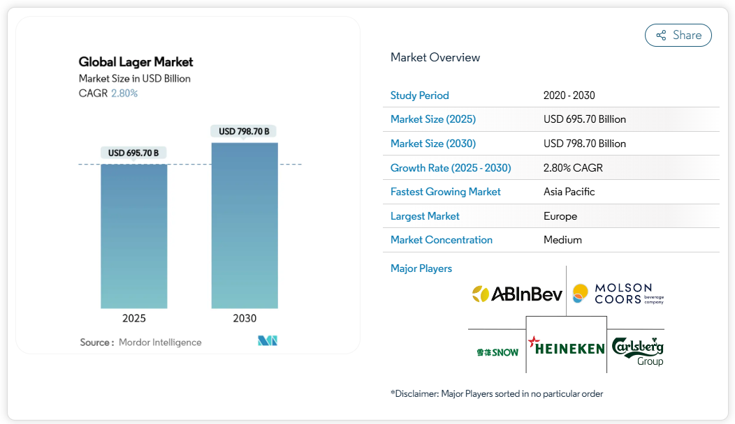 2030年までに、世界のラガービール市場規模は、2025年の6,957億米ドルから7,987億米ドルへ成長し、年平均成長率(CAGR)2.80%を記録すると予測されております。消費者の嗜好の変化、技術革新、市場アクセスの拡大に後押しされ、ラガービールの需要は急増しております。健康志向の高まりを受け、消費者はより軽やかで低カロリー、低アルコールのラガービールを求める傾向にあります。