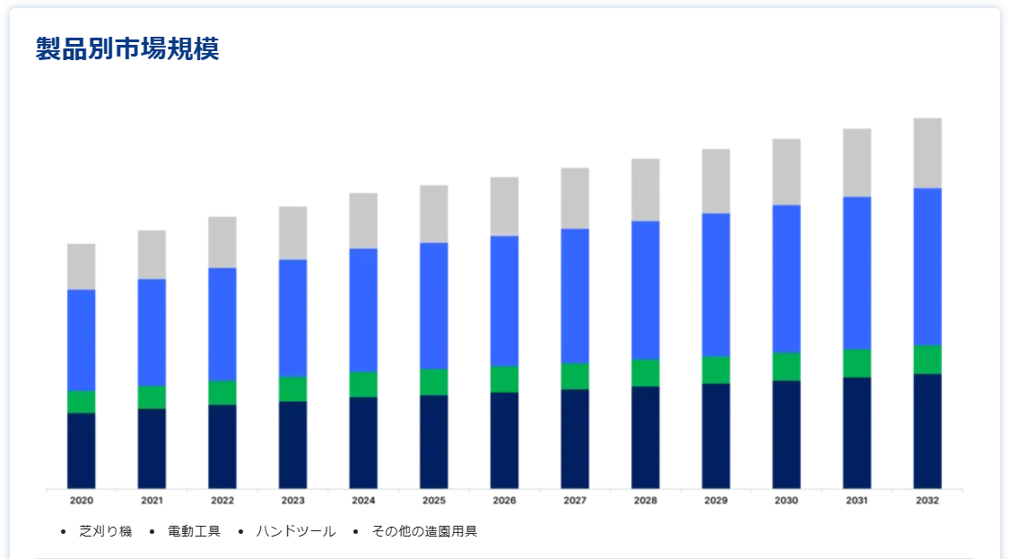 中国では最近、アジア太平洋地域の造園サービスや設備に対する需要が高まっている。 環境への配慮と庭の美化が、消費者の嗜好の変化を後押ししている。 経済が環境に優しいビジネスへとシフトするにつれて、顧客のガーデニングに対する考え方は変化しており、ガーデニング・プロジェクト用の中国製工業用工具は日々人気を集めている。 可処分所得の増加や、ガーデンパーティーの開催など裏庭での活動の人気により、工具の需要は加速している。 さらに、家庭ユーザーが造園作業でバッテリー駆動の芝生用工具を使用するようになったことで、国内の造園用工具市場の売上が増加している。 中国政府の報告によると、コミュニティ・ガーデンは社会の重要な構成要素とみなされており、これが中国におけるガーデニング用具市場の成長を支えるものと予想される。 その結果、上記の要因が同国における造園用具市場の成長を促進すると予想される。