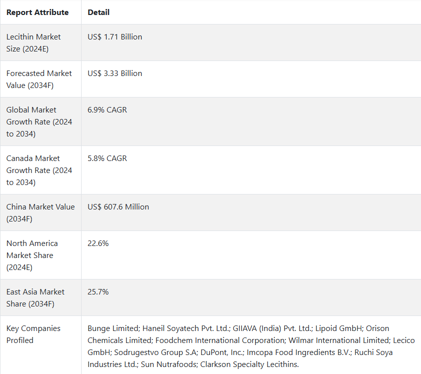 レシチンの販売による世界の収益は、2024年には17.1億米ドルに達すると予測されている。 世界のレシチン市場は、CAGR 6.9%で増加し、2034年末までに33.3億米ドルの値に上昇すると予測されている。