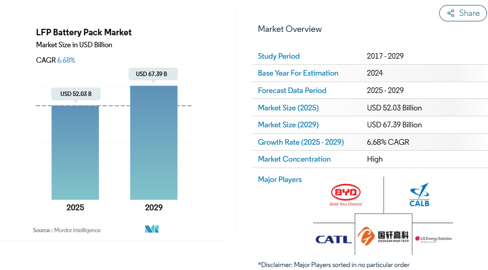 リン酸鉄リチウム電池パック市場規模は、2025年に520億3,000万米ドルと推定され、2029年までに673億9,000万米ドルに達すると予測されています。予測期間(2025年~2029年)における年平均成長率(CAGR)は6.68%と見込まれます。