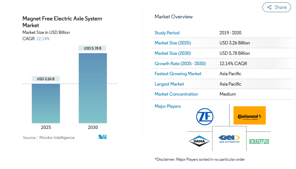 マグネットフリー電動アクスルシステム市場は中程度の集中度を示しており、主要サプライヤーが大きなシェアを占める一方で、専門特化した新規参入の余地も残されています。ZFは誘導励磁技術とモジュラー型e-axleプラットフォームにおける特許の深さで業界をリードし、出力密度を犠牲にすることなく希土類元素を排除したI²SMコンセプトで2024年CLEPAイノベーションアワードを受賞しました。コンチネンタル、ボルグワーナー、シェフラーは、内燃機関(ICE)搭載比率の低下に伴う収益保護のため、磁石非依存型ソリューションへ研究開発予算を積極的に再配分しております。