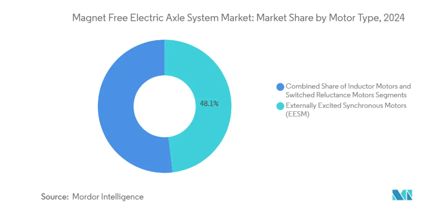 制御電子機器の継続的な進歩がEESMの市場支配力を強化しています。フィールド指向制御を備えた多相インバーターは励磁をリアルタイムで調整し、変動するトルク負荷下でも最適な効率を維持します。セグメントリーダー企業はさらに、過渡的な過負荷時の減磁リスクを軽減する高帯域磁束オブザーバーを適用しています。その結果、効率性と柔軟なパッケージングを両立させる次世代スケートボードプラットフォーム向けに、OEMメーカーがEESMを指定するケースが増加しています。物理ベース予測制御による音響特性の改善が進む中、スイッチドリラクタンスモーターの展望も明るいままです。したがって、磁石不要電動アクスルシステム市場は、成熟したEESMの供給量と急成長するSRM需要のバランスを取り、サプライヤーに多様な収益源をもたらしています。