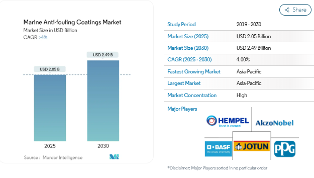 PPG Industries Inc.、Jotun、BASF SE、Hempel A/S、Akzo Nobel NVが海洋防汚塗料市場で事業を展開している主要企業です。