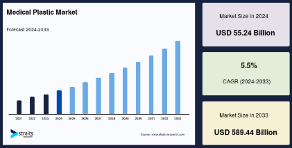 医療用プラスチックの世界市場規模は、2024年には552億4000万米ドルとなり、2025年には582億8000万米ドル、2033年には894億4000万米ドルに達すると予測され、予測期間中(2025〜2033年)の年平均成長率は5.5%です。