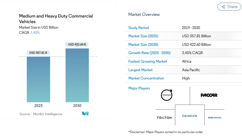 中型・大型商用車市場規模は、2025年に3,578億1,000万米ドルと推定され、予測期間(2025-2030年)において年平均成長率(CAGR)3.40%で推移し、2030年までに4,226億米ドルに達すると見込まれております。この着実な拡大は、ヨーロッパにおけるユーロVII規制や北米のEPA 2027規制への適合が進むとともに、アジア太平洋地域、ラテンアメリカ、アフリカにおけるインフラ近代化が背景にあります。