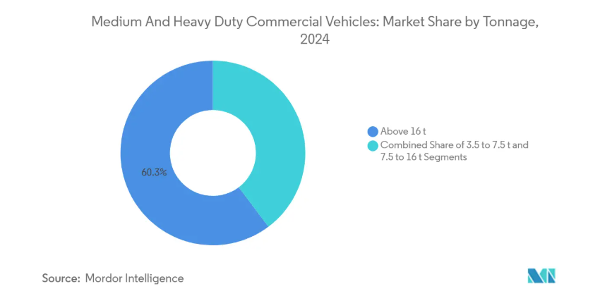 16 トン以上のモデルは、2024 年の中型および大型商用車市場シェアの約 60.26% を占め、中型および大型商用車市場で最大のシェアを確保しています。需要は、充電時の利便性よりも積載能力を優先する長距離貨物ネットワークによって支えられています。一方、3.5~7.5トンクラスの中型・大型商用車は、都市配送プラットフォームの普及に伴い、7.81%のCAGRで拡大しており、他の全セグメントを上回る成長率を示しています。このセグメントは、日常的な運行ルートには100~200kWhのバッテリーパックで十分であるため、資本支出と充電の複雑さを軽減できるという利点があります。一方、7.5~16トンクラスの中型車両は、建設・自治体調達サイクルに連動した安定した更新需要が見込まれます。