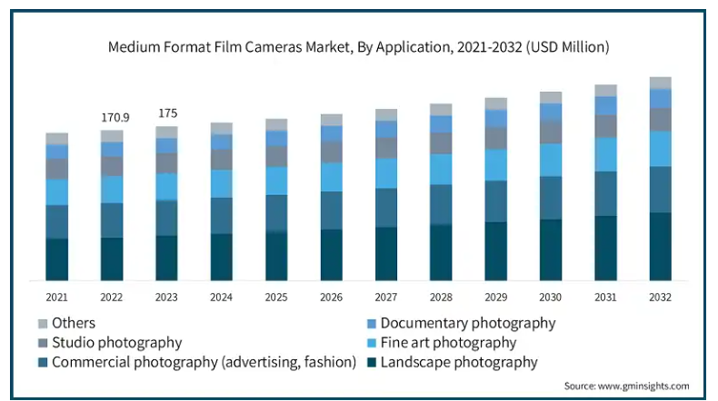 中国市場は、コレクター、アマチュア、一部のプロフェッショナルフォトグラファーを主な要因として、緩やかに進展しています。デジタル写真が主流であるにもかかわらず、北京や上海などの都市部では若年層を中心にアナログ写真へのわずかな傾向が見られます。この傾向の要因の一つは、展覧会やアート展、フィルム写真支援のオンライングループが増加していることです。その結果、古い中判フィルムカメラの需要が増加しており、これらのカメラの二次供給を増加させるフィルム現像サービスも拡大しています。