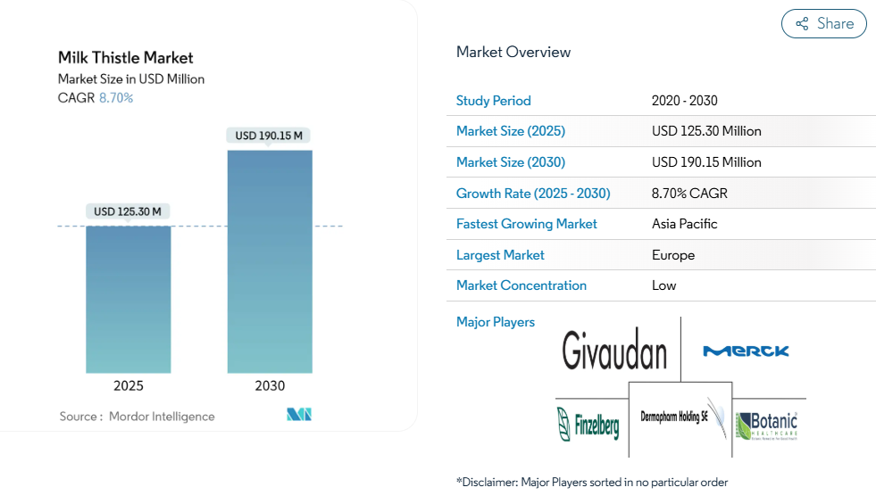 世界のミルクシスル市場は、集中度が10社中2社と分散状態を示しています。確立された植物エキス企業は、先進的な抽出技術と消費者直販モデルを活用する新規参入企業と競合しています。ジボダン社やE.メルクKG社などの企業は、垂直統合、品質認証、医薬品・栄養補助食品メーカーとの確立された関係を通じて市場での地位を維持しています。