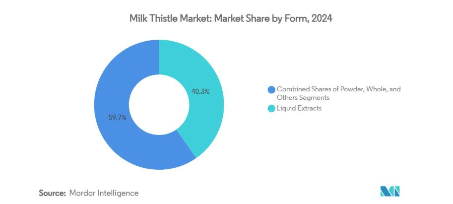 液体抽出物は2024年に40.31%の市場シェアを占めており、これは製薬・栄養補助食品メーカーが、正確な投与量と品質管理を可能にする標準化されたシリマリン濃度を好むことを反映しています。この優位性は、液体製剤の優れた生物学的利用能と速い吸収率に起因しており、一貫した血中濃度維持が重要な治療用途で好まれています。しかしながら、粉末製剤は2030年まで年平均成長率9.65%と最も急速な成長を見せております。これは、機能性食品への統合と、消費者が手軽な摂取形態を好む傾向に後押しされております。