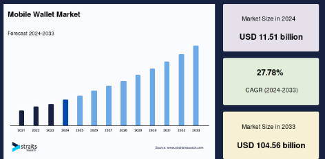 世界のモバイルウォレット市場は、2024年に115.1億米ドルの価値があり、2025年には147.1億米ドルに成長し、2033年には1044.6億米ドルに達すると予想されています。予測期間(2025年~2033年)の間に年平均成長率(CAGR)は27.78%です。近年、デジタル化の急速な進展により、インターネットとスマートフォンの普及が爆発的に増加し、これが世界のモバイルウォレット市場を後押ししています。特にアジア太平洋地域、ラテンアメリカ、アフリカなどの新興地域では、インターネットとスマートフォンの普及が著しく、これが市場成長の機会を生み出しています。