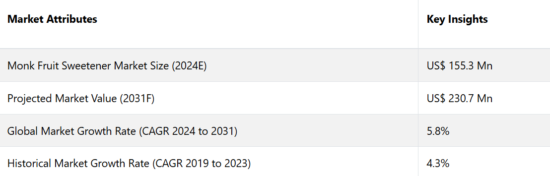 2019年から2023年の期間、羅漢果甘味料市場は年平均成長率4.3%で着実に成長しました。これは、天然甘味料の健康効果に対する消費者の認識が高まったことが要因です。市場はニッチな健康食品店から主流の小売チャネルへと拡大し、より幅広い層に受け入れられていることを反映しています。