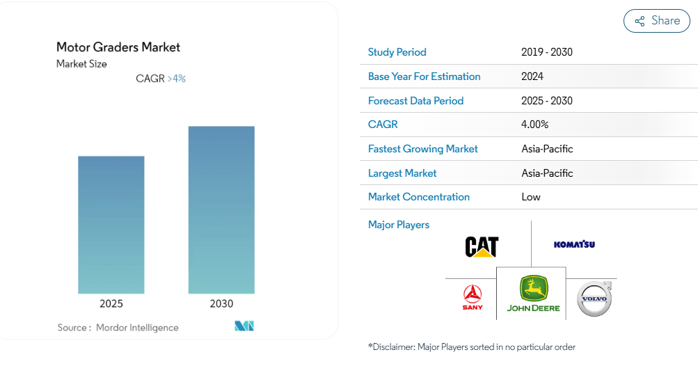 モーターグレーダー市場は、予測期間中に4%を超える年平均成長率(CAGR)を記録すると見込まれております。