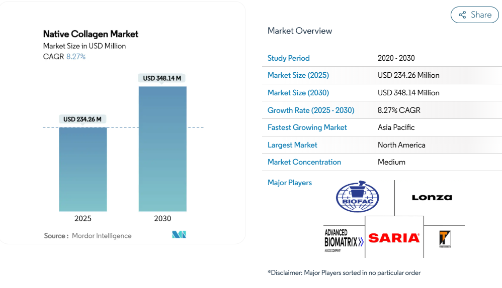 天然コラーゲン市場の規模は、2025年に2億3426万米ドルと評価され、2030年までに3億4814万米ドルに達すると予測されており、この期間において年平均成長率(CAGR)8.27%を記録する見込みです。需要は加水分解コラーゲンから天然コラーゲンへと移行しています。これは、完全な三重らせん構造が組織再生、免疫調節、および美容効果においてより高い生物活性を提供するためです。