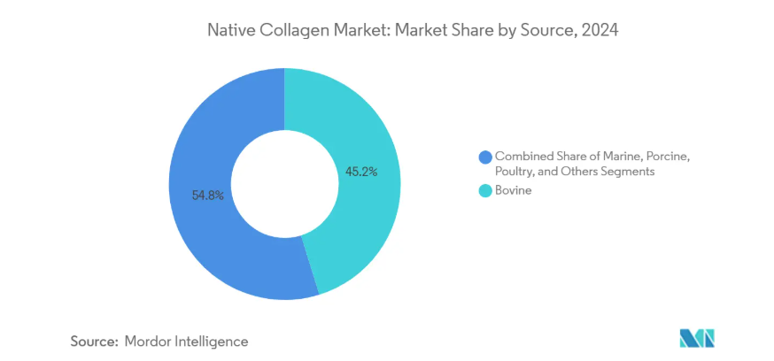 2024年現在、牛コラーゲンは確立された供給網と、畜産業の豊富な副産物を活用したコスト効率の高い加工インフラに支えられ、45.17%という圧倒的な市場シェアを占めています。この優位性は、成熟した抽出技術と主要市場における深い規制理解によって裏付けられています。特にNURA USAのような企業が主導的役割を果たしており、草飼牛由来のコラーゲンを96%という驚異的なタンパク質含有率で提供すると同時に、プレミアム飲料用途向けのGMP認証を取得しています。しかしながら、課題も存在します。サプライチェーンの脆弱性が成長を阻害しており、米国国内で調達される牛コラーゲンはわずか30~40%に留まっています。この制約により、製造業者は国際調達に頼らざるを得ず、コスト上昇だけでなく規制順守の要求も高まっています。牛コラーゲンは確固たる臨床的裏付けと認知度の高い消費者基盤を有していますが、持続可能性への懸念や倫理的議論の高まりにより、長期的な市場ポジションは厳しい挑戦に直面しています。