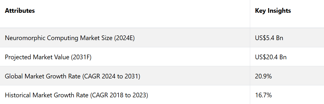世界のニューロモーフィックコンピューティング市場は、2024年の54億米ドルから2031年末までに204億米ドルに増加し、2024年から2031年の予測期間にわたって20.9%のCAGRを確保すると予想される。