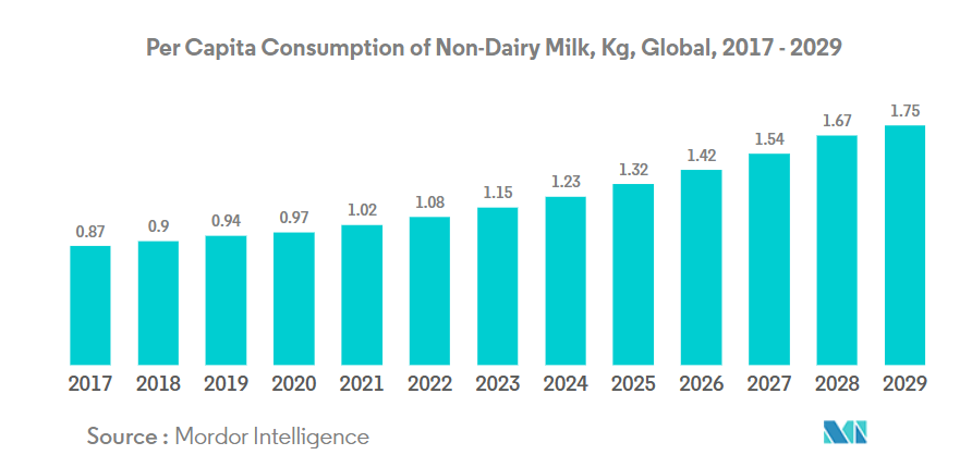 非乳製品ミルク産業は、変化する消費者の嗜好とライフスタイルの変化に牽引され、大きな変革を経験しています。2022年の世界の植物性ミルクの一人当たり消費量は1.28kgに達し、様々な消費者層における乳製品代替品の受容拡大を反映しています。