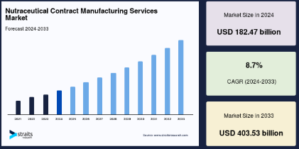 パーソナライズド・ニュートラシューティカルのこの成長傾向は、専門製造サービスにとって大きなチャンスとなり、ニュートラシューティカル業界における受託製造市場を牽引しています。