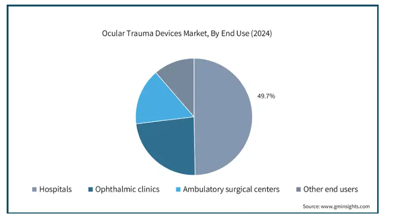 エンドユーザー別では、眼外傷装置市場は病院、眼科クリニック、外来手術センター、その他のエンドユーザーに分類されます。病院セグメントは2024年に49.7%のシェアで市場を支配しました。