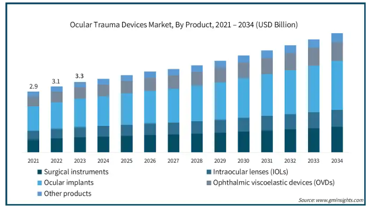 2021年の世界市場規模は29億米ドル。翌年には31億米ドルに微増し、2023年にはさらに33億米ドルに上昇しました。製品別では、手術器具、眼内レンズ(IOL)、眼インプラント、眼用粘弾性装置(OVD)、その他の製品に区分されます。